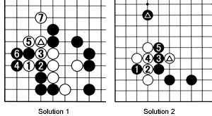 Solution 1: White 1 induces black 2, allowing White to connect at 3. After taking sente with 5, White can move out with 7.