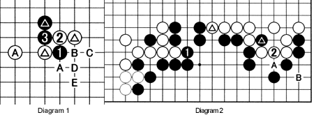 Diagram 2: In the fourth game in the Meijin title match between Kato (White) and titleholder Koichi Kobayashi, we get this situation. In response to the marked white stone, Black protects with 1. This looks like his best move, but it induced a dazzling tesuji by Kato. After thinking for more than an hour, instead of forcing A for B and switching elsewhere, Kato chose to capture the marked black stone in gote with 2. On TV, Kobayashi said he could not see how White could lay waste to his territory and played elsewhere to make 6.5 points. White seemed to have blundered, but had he?