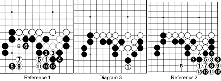 Reference 1: White can force A for B at any time. White 1 is tsuke-koshi. The moves through 4 seem to be forced. After 5, Black needs to set up a defense, e.g., at 6, as this leaves the fewest sente moves for White. White 7 seems good, but after black 10 and 12, White cannot make two eyes. Therefore, this is no good for White.