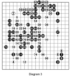 Diagram 2: White 16 through 22 are very instructive as White resists the understandable temptation to invade and opts for pressing Black back so he can build thickness. In the hope that White will connect at A, black 23 is a good move, but 24 is a strong move as it performs half a hasami-tsuke, with a stone later intended for A. Black 25 is a modest move and white 26 completes his wall. With the aim of completing the hasami-tsuke at B, black 27 seems natural, but with 28, White launches a marathon attack, lasting to the end of this diagram. Black could have prevented this by playing 37 at 38, but this would have given White an edge on the right side of the board by playing at C. However, with 96, White overstretches himself a bit.