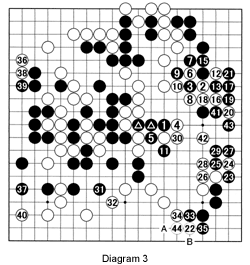 Diagram 3: (white 14 captures ko at 6) Due to White's "greed" on the lower side, Black can take the initiative and capture some stones in the center, but at the cost of White breaking through on the right. Black 41 and 43 are the losing moves. He should have cut at 44 and capture white 22 with B after white A. This would have set up a brilliant hasami-tsuke combination (see Problem 3). In the end, White won the game by 4! points.
