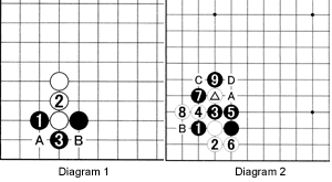 Diagram 2: Should White play at 2, black 3 through 9 would trap the marked stone in a ladder. After capturing with A, White has to defend once more with B. Even if the ladder is unfavorable, Black can play at C instead of 9. This would be followed by white B and black D. Both variations favor Black.