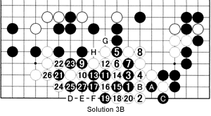 Solution 3A: Last week, we saw the veteran Koichi Kobayashi (Black) lose to his son-in-law, Meijin and Honinbo titleholder Cho U, in his bid to capture the NEC title for the second straight time. He lost because he did not see the winning combination black A, white B and black C. Had he played this combination, White would not have defended this position because he would have lost outright. The hasami-tsuke of 1 is destructive as Black uses 21 through 27 to increase his liberties by one. After 27, if White connects at 21, Black will connect at 16, giving him three liberties at D, E and F, against White's two at G and H. Therefore, Black wins the semeai (capturing race) and the game. If you saw this solution, you are partly correct.