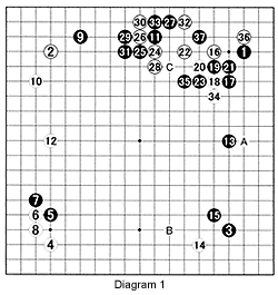 Diagram 1: With 12 and 13, White and Black follow their own paths. Black 15 is unusual but helps set up a huge framework on the right. This prompts White to invade with 16, instead of extending to B, the usual response. Following white 18, black 19 starts an aggressive effort to cut with 23 in an attempt to expand the right side. White wants to set his stone at 18 free. However, doing so immediately is dangerous as Black could hurt him by playing at C, the vital point of this shape. To prevent this, White first uses the crosscut tesuji 24-26. Black manages to immobilize two white stones, but White improves his shape sufficiently to allow him to free up 18 with 34. White tries to settle his stones with 36, but the nozoki (peeking) move at 37 is a strong countermove that launches a long and fierce battle. We will continue this game next week.