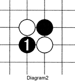 Diagram 2: Black 1 illustrates the crosscut. Although black 1 cuts his opponent's stones, his own stones are cut in a similar manner. White can capture either of Black's stones, but at the cost of Black strengthening his other stone.