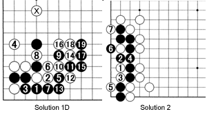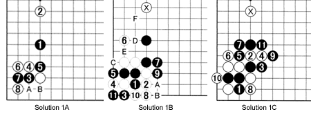 Solution 1C: In this situation, white 2 is a popular move. Depending on the ladder, the moves through 11 are one possibility. Again, White's marked stone is in a strange place.