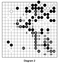Reference: (black 9 captures 6 at 1) After black 1 (17 in Diagram 2), if White connects at 2, this would be followed by black 3, white 4, black 5, white 6 (which would capture the ko), black 7, white 8 and black 9, which would recapture the ko. White could not win the ko and would, therefore, lose the game. Note that after Black plays at 3, White's marked stones are in danger too.