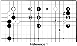 Reference 1: Building up thickness in sente with 4 and 6 enables White to take the initiative with 8 and 10. After 11, White can jump to A. His stones are not in danger as he can head for the center or make eyes with B. Compared to Diagram 1, White's territory on the left is about 20 points more while Black's gain on the right is about the same. However, the important difference is that Black's stones 1, 9 and 11 encompass no territory and are therefore weak--a difference of more than 10 points.