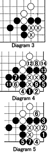 Diagram 4: (10 connects at 1): Black 1 seems the most natural move. However, in the sequence through 14, Black loses the semeai (capturing race). Because of the 6-7 exchange, Black is slowed down by one move.