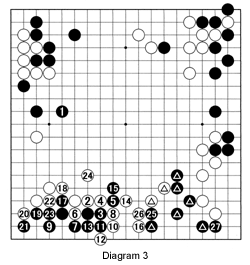 Diagram 3 (1-27 represents 57-83): After black 1, white 2 is urgent. Why? To start with the conclusion, it sets off a series of events leading to the strengthening of White's marked stones, weakening of Black's marked stones and grabbing the initiative in the center for White. The sequence is in stark contrast to Reference 2. I hope this illustrates the implications of urgency. We will continue this game next week.