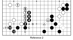 Reference 2: After white 1, Black might play at 2, which could trigger the sequence through 9. Black 10 and 12 defend against the cut at A--White's cutting stones will die if followed by the sequence black B, white C and black D. As you can see, White's marked stones are also up against the wall, literally. Also, White's territory on the left is no match for Black's center influence.