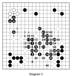 Diagram 3 (1-47 represents moves 43-89): Shinji probably felt he didn't need to kill or couldn't kill Black's stones. Perhaps he thought he could win on territory by defending at 4 and chase Black out. However, in the sequence through 47, Black cleverly extracted his stones. Without sufficient territory, the game is now hopeless for White. If you are wondering why Black did not try to escape by playing at 26 (instead of 19 through 25), White would respond with A, followed by black B, white C, black D and white E. This would wreak havoc on Black's marked stones.