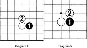 Diagram 5: Even worse, if Black plays at 1, White may play hane at 2. Now, with only two liberties left, it is Black rather than White who is under attack.