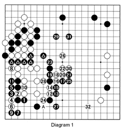 Diagram 1: (1-32 represents moves 55-86): Black has a very good position at the outset, but he then played at 1, which was a mistake. Cho knew he should not try to kill the lower left white group. However, black 1 is aimed at surrounding White. This gives White the opportunity to move two stones (4 and 6) into enemy territory and force Black to waste two moves (7 and 9) to capture them. White 8 weakens the marked black stones, and 10 makes eyes. Because Black's marked stones are weakened, White can cut through with 12, 14 and 16, eventually forcing Black to connect at 25 in response to 24, which leaves a gaping hole at A. By the time White plays at 32, he has turned the tables. In the end, White won by half a point, so Takao took the Honinbo title four games to one.
