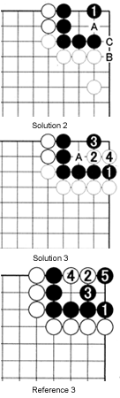 Reference 3 (failure): After black 1, white 2 looks like a good move, but now Black can squeeze a ko out of it with 3 and 5. It is obvious that white 2 in Solution 3 is superior.