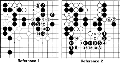 Reference 1: Instead of 41, couldn't Black have played at 1? White 2, 4 and 6 are effective. Black 7 is sente, meaning White has to answer at 8 to prevent Black attaching at A. Black 9 then appears to have trapped 4 and 6, but white 10 cleverly counters this. After 14, Black has two defects at B and at C and can only defend one of them. White can free up his stones by playing the other move.