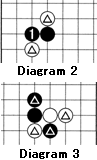 Diagram 2: We already know this type of cut in a keima (White's knight formation of two marked stones) is bad for White. However, a similar shape often becomes a point of contention.