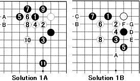 Solution 1A: Black 1 is a type of trick move employed by aggressive players. White must split Black's two stones with 2. Usually a development like the one shown takes place. After exchanging 10 for 11, White can safely play at A or push Black with B. Either way, White is doing well.