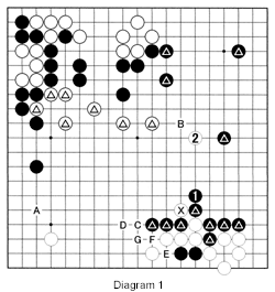 Diagram 1 (1 and 2 represent moves 69 and 70): Black 1 was the final move last week. The question we asked was where should White play? White 2 is a move that deserves attention as it combines a number of important functions. The stone strengthens the marked white group, reduces the influence of the marked black stones, aims at an invasion on the right, and plans to help the stone marked with an X at a later stage. Now imagine if White played at A while Black played at B. Black would be able to expand his territory on the right while attacking White's marked stones. Note that black B and C are sente as either of these moves threaten the sequence of black E, white F and black G, leading to the capture of some white stones.