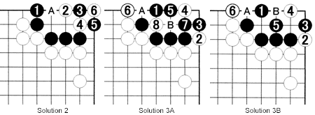 Solution 3A: Black 1 is bad because White can now kill with the combination of 2 and 4. White 6 is good. When Black plays at 7, white 8 may come as a surprise. It takes away Black's second eye. Black cannot play at A (as White will capture with B), but if he captures at B instead, white A kills him anyway. In other words, Black is dead.