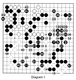 Diagram 1 (1-52 represent moves 99-150): Last week, Black cut White's center group in half and is now attacking the right side. With 1, Black threatens to cut with black 9, followed by white 12 and black A. Forced to defend, White comes up with the beautiful combination of 2 and 4. The latter cuts through the keima (knight's jump) shape formed by the marked black stone and black 1. If his counteroffensive works, this is perfect for White. Indeed, Black plays at 5 instead of cutting with 6 (see Reference 1). Black 9 is a mistake. He should first exchange 10 for B, then push at 9, which would be dangerous for White as he would probably have to allow black B and abandon his marked stones. White 10 is a good move that puts a stop to Black's attack. After this, the game is quickly over as White breaks through on the right. Black resigns after white 52.