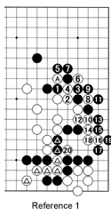 Reference 1: A Black cut at 1 after White plays the stone marked A could land him in trouble if White cuts through on the right side, e.g. with the combination 6 through 18. With white 20, Black loses his marked stones as well as his threat against the marked white stones.