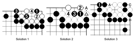 Solution 3: This is a funny problem because black 1 seems to do nothing right away. However, it prevents White from playing at A. This allows Black to play there himself, if White captures his stones with B or C.