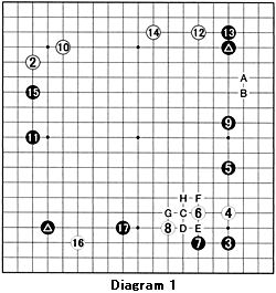 Diagram 1 (Black 1 is represented by the two marked handicap stones): Black 13 might be better at A. After strengthening his stones 4, 6 and 8, White can invade at B, which would be a serious problem for Black. Black 15 might be better at 16--this threatens the cut at C, followed by the sequence white D, black E, white F and black H or G. Black 17 is an aggressive move. How did White deal with this invasion and what will Black's follow-up be? We will continue this game next week.