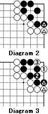 Diagram 3: Because of this exchange, White can play at 1. Black has little choice but to connect at 2, after which White starts a ko with 3.