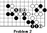 Problem 2: This is from a famous game in 1872 in which Shuho Murase (who later became Honinbo) lost a game to Honinbo Shuwa (white) by 3 points due to a blunder involving damezumari. The blunder was the combination 1 and 3, which White took advantage of after black 7. Where did White play?