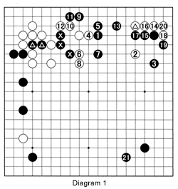 Diagram 1 (1-21 represents moves 25-45): Black has just sacrificed the two stones marked with triangles. The problem is what should he do with the three stones marked with crosses. Generally, he would play as in Reference 1, but in the game he continues to sacrifice by pincering with 1. White then exchanges 2 for 3 to strengthen his marked stone before capturing Black's stones with 4 through 12. After 13, White has little choice but to attach at 14 to strengthen his marked stone. Cho would not normally play at 15 and 17 because it gives White a lot of territory, but in this case, it is good for Black as he can develop the lower right with 21.