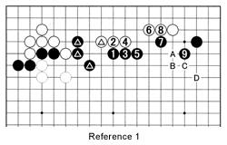 Reference 2: If White plays at 1 immediately, Black will respond with 2. White 3 and 5 are a clever combination, but White is in trouble after 8. White can exchange C or D for A, but Black has the initiative. Note that white A will be answered by black B. In effect, Black has saved one move (at C) in the corner to take the lead in the center.