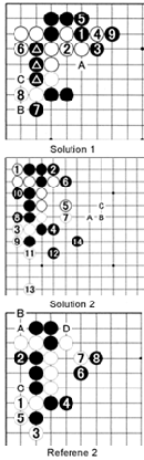 Problem 2: The double hane is often associated with sacrifice. Black can implement such a strategy with 4 (hane) and 6 (double hane). How should White respond? Try to work out two completely different sacrifice strategies for White.