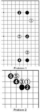 Problem 1: In a six-stone handicap game, the moves through 5 are a common strategy for White. Black could keep the marked stone in play, but it is also possible for him to sacrifice it. How should he do this to his own advantage?