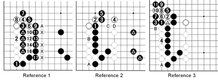 Reference 1: Black 1 (33 in Diagram 1) allows white 2 to repair her defects. In addition, white 2 restricts the liberties of Black's marked stones. For example, if Black plays 5 straight away (without exchanging 9 for A as in the game), White can cut with 6. However, Black has no problem in sacrificing these stones with 9 through 17, because White's marked stones are weakened significantly. This is a good result for Black.