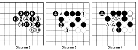 Diagram 4: If Black immediately defends without the exchange A for B, he may be able to pull out his stone with 1, while threatening the marked white stones.