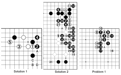 Problem 1: The moves through 11 are a joseki. The stone at 2 still has potential. White 12 threatens A so the moves through 17 are forced. White can play at 18 to exploit the potential of white 2. But what is he really aiming at?