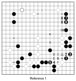 Reference 1: After black 1 and 3, the exchange 4 for 5 is good for White. However, he does not need to worry too much about the cut of black A, which would be followed by white B and black C, as white D will be sacrificing his marked stone and the stone at 2 in the process. More troublesome for Black would be the exchange black E for white F, after white A. Even if Black jumps to G, White can stop his progress with H. More important, though, is for White to prevent an invasion at I by strengthening his position with 6 through 10. White now has a good game.