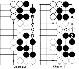 Diagram 2: Question every move you make, especially ones played automatically, because they could constitute some kind of aji-keshi, in which you erase potential problems in the opponent's position. As White, are you tempted to force the exchange black A for white B, followed by black C and white D? If so, you are committing aji-keshi, because this would allow both of Black's groups to live unconditionally.
