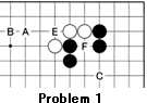 Problem 1: After the joseki in Diagram 2, White needs to reinforce with A or B--these moves seem alike but A poses a big threat. In response, Black will usually defend at C or D. If White plays at A, how should Black respond? And if White extends to B, how should Black respond then? Hint: Look at the cuts at E and F.