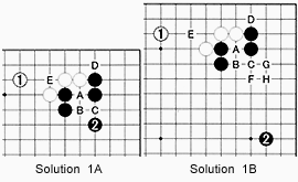 Solution 1B: When White extends to 1, Black can also extend to 2. This is because there is no direct threat of a cut at A, followed by black B and white C. If White does cut there, Black would descend to D, forcing White to defend at E, and then playing at F, followed by white G and black H. These white cutting stones will die as we discussed last week.