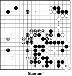 Diagram 1 (1-24 represent moves 71-94): Since Black is behind, he played tenuki (elsewhere) at 1 and White attacked with 2, the vital spot. Note White allows Black to connect with 5, but leaves a cut at A. White now makes a few kikashi (forcing) moves with 6 and 8, making full use of his marked stone. This cutting stone has given White many benefits, including capturing a stone at B, a kikashi at C, at 6 and again at 8 (see Reference 1). Next, White turns his attention back to the center and attacks with 12, to build a wall in the sequence through 22. Black is still handicapped by a cut at A and must play at 23 to neutralize White's center influence somehow. After white 24, Black keeps fighting an uphill battle and, after a series of mistakes by White, eventually wins this game.