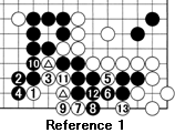 Reference 1 : After white 1, if Black resists with 2, White makes maximum use of his marked stones to play the strong combination of 3 through 7. Black is lost as the moves to 13 demonstrate. Therefore, in the game, Black had no choice but to pull back at 3.