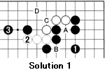 Solution 1: The cuts at A, B, and C are all important. However, since Black cannot cut at C, it is a good idea to defend against A and B at the same time with 1. After 2, jumping to 3 is good move. Later, he can play D to threaten a cut at C.
