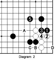 Diagram 2: Black cannot cut immediately at 4. However, threatening to cut there with 1 is a good move. After the 1 through 4 exchange, Black forces White to move out with A or make life through the sequence white B, black C and white D.