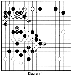 Diagram 1 (1-22 represents moves 33-54): Black strikes at the vital point with 1. He could have cut, but this would weaken his overall position. Black 1 forces White to exchange 2 for 3 (strengthening Black). Next, White sacrifices 4 to make Black play 5 and 7 in order to take sente and switch to 8. This leads to the forced exchange through to 11. White is the benefactor of this kikashi. Black's stones at 9 and 11 only defend and are directed toward the inside whereas white 8 and 10 are directed to the outside and have a much greater impact, making 12 possible. If Black pushes through at A, White plays kikashi with B, forcing Black to answer at C. White would then cut at D. This is possible for White because he is strong in the top left and threatens to cut with E, which would be followed by black F and white G. Black cannot risk a direct fight, so he first cuts with 13, followed by 15 and 17. To cope with this cut, White first needs to make a kikashi at 18 and one at 20. If Black does not answer in the top left, a placement at H captures the black stones 13 and 15 or the entire corner. Black 21 is one way to defend the corner. However, thanks to his stone at 18, White can now immobilize 17 by playing at 22. Note White does not want to make the I for black J exchange as this invalidates the cut starting with E. We will continue this game next week.
