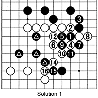 Solution 1 (Black plays 13 where he captured white 4): The question was, can Black cut with 1. White 2 through 6 are an appropriate answer, To escape, Black must play 7 and 9, but White sets up a squeeze with 10 and 12, and then cuts with 14 and 16. Black's marked stones are in trouble now.