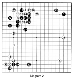 Diagram 2: After 6, Black wants to force the kikashi 7 for A in order to pincer at B. However, White counters with 8 through 14. In a way, the exchange 15 (most important) for 16 (second most important) is a kikashi for Black. Black 17 and 19 are an attempt to avoid making a forced move (see Reference 1) and force a kikashi himself (see Reference 2). White 20 avoids that and uses a kikashi himself with 22 through 26. White then plays the kikashi exchange 28 through 33, before turning to the most important spot on the board at 34. We will resume this game next week.