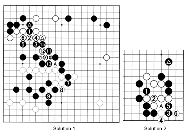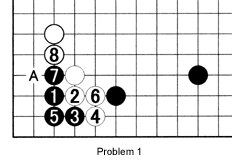 Problem 1: If Black wants to invade White's corner, he can do so with 1 through 7. After 8, he needs to play at A to ensure that he will live. But before doing so, he can play kikashi. Where should Black play before defending his corner at A?
