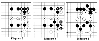 Diagram 3: After 3, if Black foolishly answers with 4, White will exchange 5 for 6, and then connect with 7. If Black tries to split White with A, this will be followed by white B, black C, white D, black E and white F. Black will live, but White's marked stones are connected and strong.